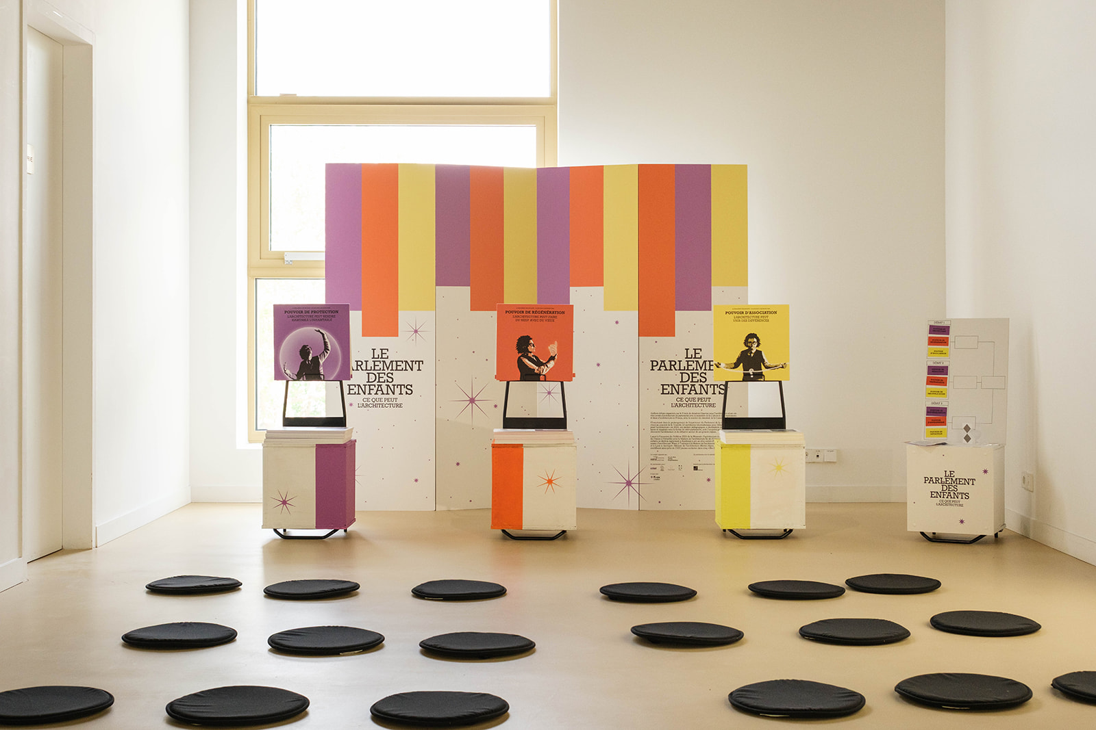 Ces ateliers pédagogiques, imaginés sous la forme de mini-parlements, seront l’occasion pour les enfants de découvrir l’architecture et de débattre autour de ses grands enjeux, révélés par le Parlement de la recherche. Au sein d’un dispositif scénographique spécifique s’inspirant des configurations et codes habituels des lieux de débats (pupitres, micros, temps de paroles, audience circulaire), ces ateliers-débats, conçus par +Mieux Créations, offriront un contenu pédagogiques adapté au jeune public et seront également l’occasion de sensibiliser les enfants à l’importance de l’écoute, de l’échange, du débat et de s’engager pour défendre un point de vue.