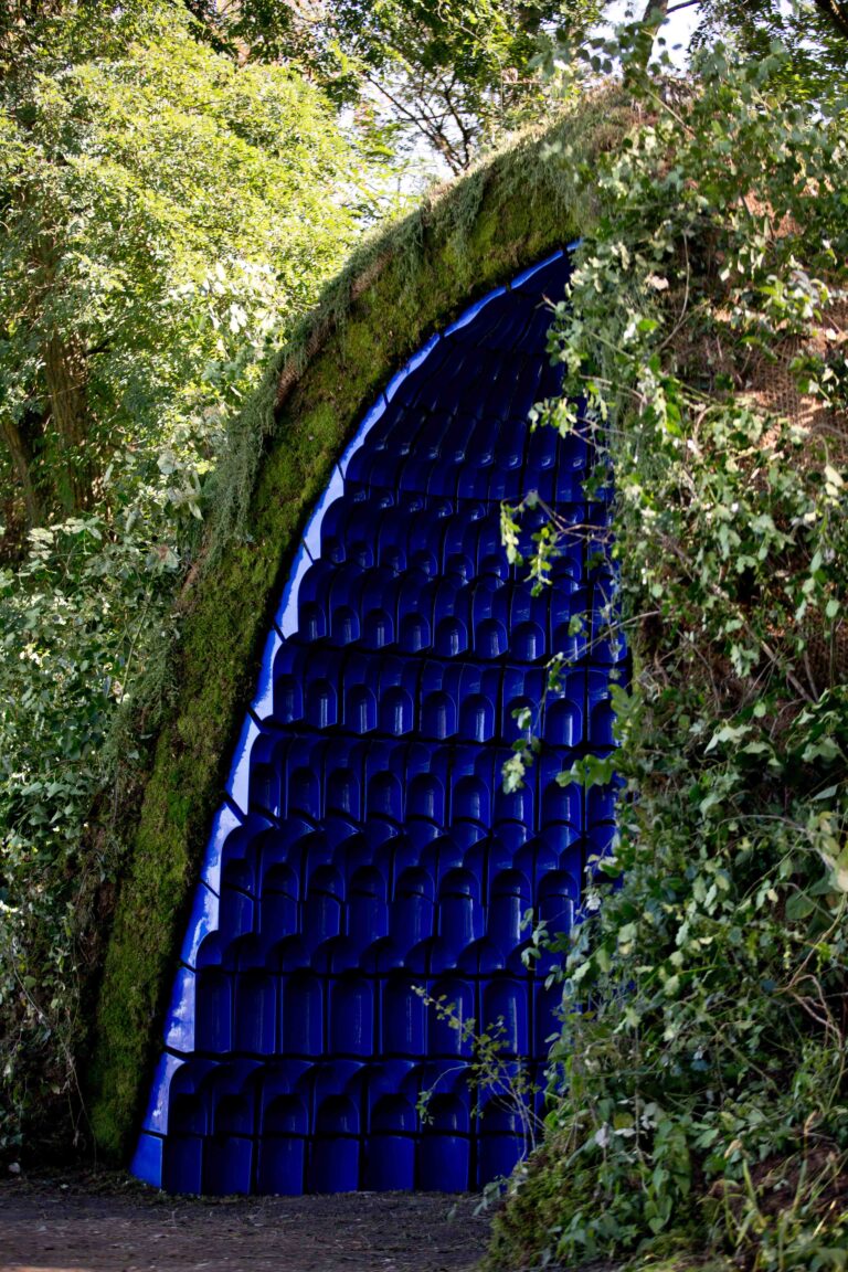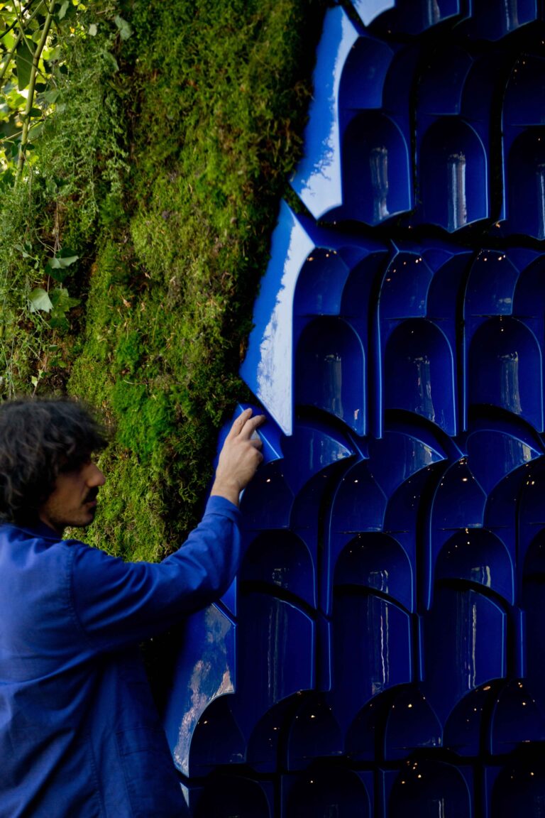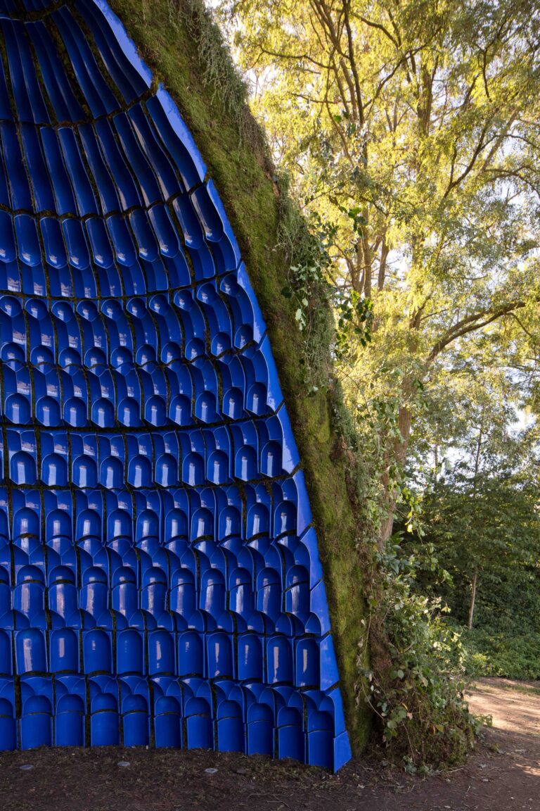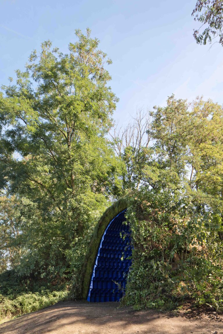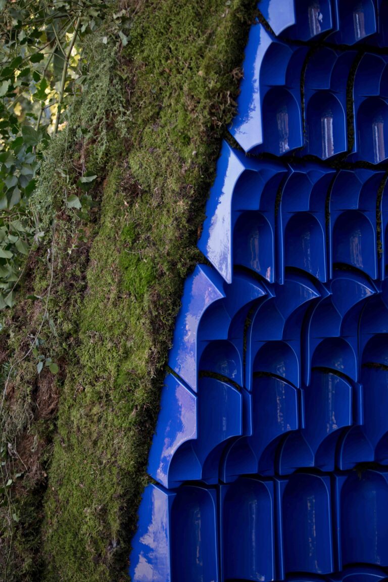 Après la réalisation d’un premier prototype partiel au CIVA (Bruxelles), le pavillon est accueilli à Saint-Etienne dans le parc Explora où il devient un nid à deux faces : une face ludique à destination d’enfants, et une face à destination d’oiseaux, insectes et rongeurs. Les aspérités intégrales au motif deviennent autant d’habitats pour le vivant, à l’image des nids d’hirondelles intégrés aux façades de lieux de cultes ottomans.