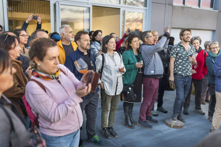 Moment convivial et collectif sur la terrasse de la Fabrique Pola, face au coucher de soleil bordelais et rencontre avec Guillaume Aubry, architecte et artiste.